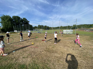 Einen besonders bewegungsreichen Tag erlebten unsere Schülerinnen und Schüler bei perfektem Wetter am Brückentag nach Christi Himmelfahrt. Nach einer gemeinsamen Begrüßung und der Einstimmung auf den Tag mit dem "Sportinator" warteten an verschiedenen Stationen die unterschiedlichsten Bewegungsaufgaben auf die Kinder. So konnten sie Pedalo fahren, Seil springen, mit einem großen Schwungtuch oder zahlreichen Bällen spielen und sich in Laufstaffeln messen.